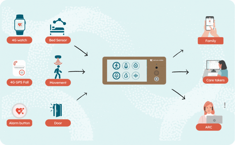 This segment focuses on technologies and services that support elderly people and those with disabilities to continue living independently at home for longer. The emphasis is on safety, monitoring, and communication between the client, informal carer, and care provider.